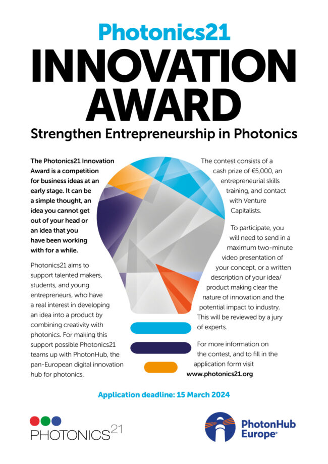 Der „Call for Applications“ für den Photonics21 Innovation Award 2024 ist offen und wir dürfen Sie herzlich zur Einreichung ermutigen! Dieser spezielle Innovationswettbewerb soll zu mehr Unternehmertum in der Photonik…