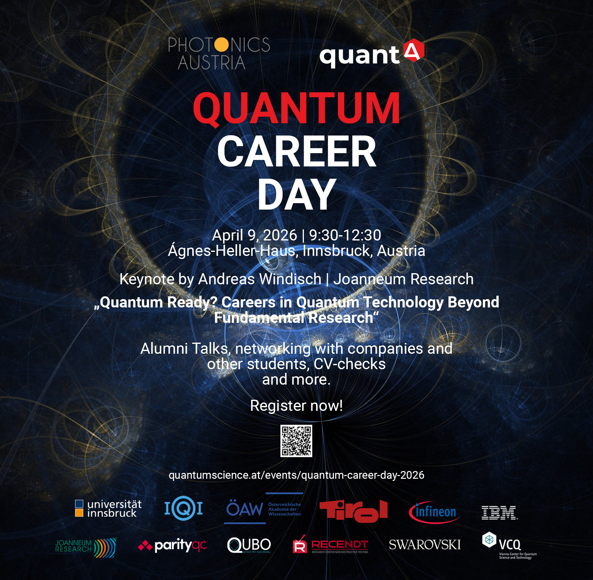 Photonics Austria, das Universität Innsbruck Career-Service, und quantA laden Studenten und and Nachwuchswissenschaftler herzlich zum Quantum Career Day ein! Vielfältige Talks, Networking opportunities, CV checks, und vieles mehr erwartet euch!   Datum & Ort: 09. April 2026, 9:30-12:00 Uhr, Agnes Heller Haus, SR 11-14, 6020 Innsbruck Zielgruppe: Studenten und and Nachwuchswissenschaftler im Themenfeld Quantum Sprache: Englisch…