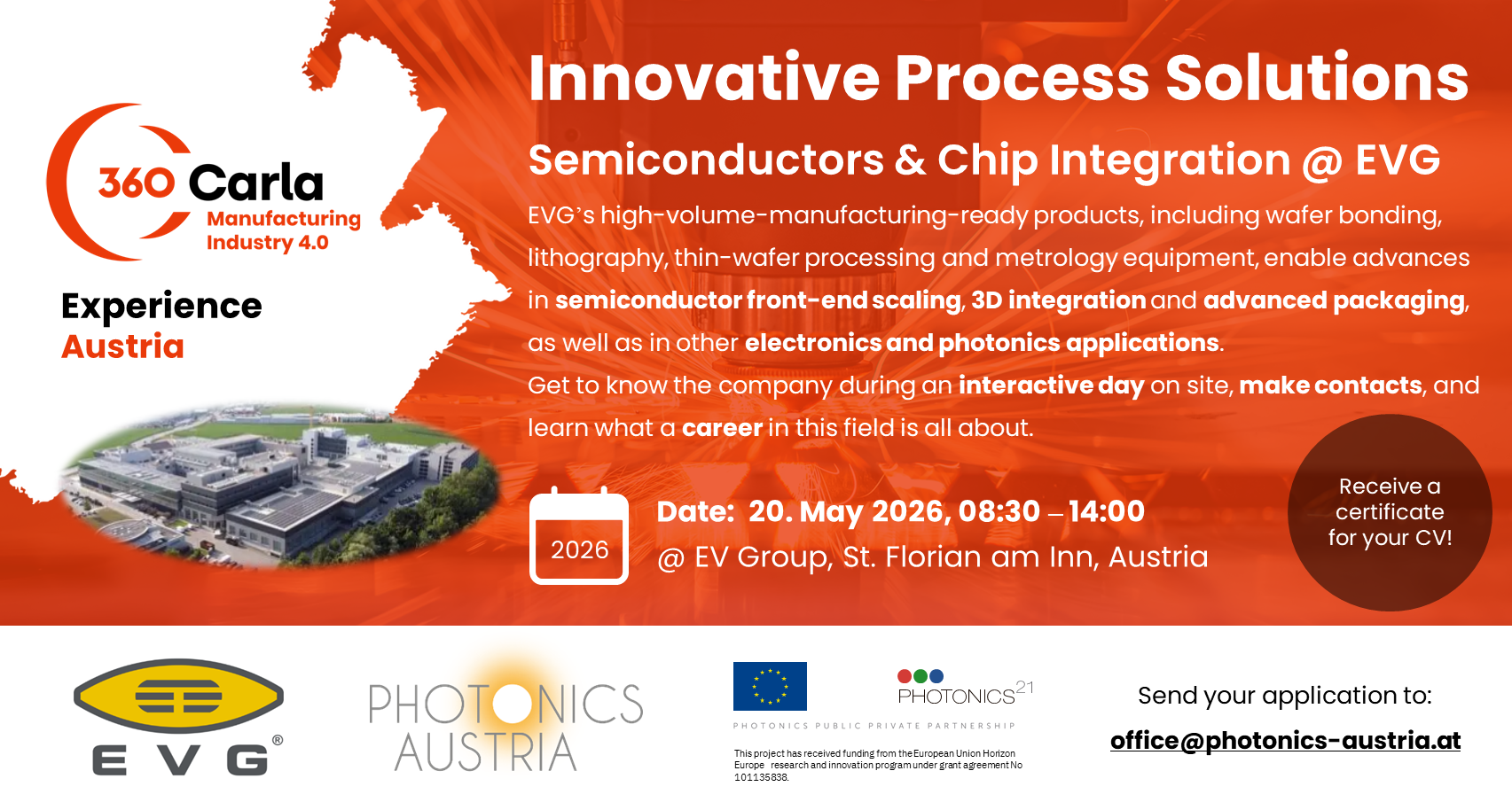 Am 11. Mai 2026 veranstalten wir in Kooperation mit der Technischen Universität Wien und Cerabyte im Rahmen des Projektes 360CARLA ein Training mit Schwerpunkt "Manufacturing" wo Studierenden die Möglichkeit geboten wird sich mit Expert*innen im jeweiligen Fachbereich auszutauschen und ihre Skills und Fähigkeiten näher zu beleuchten sowie auszubauen. Sie erfahren was es braucht um in…